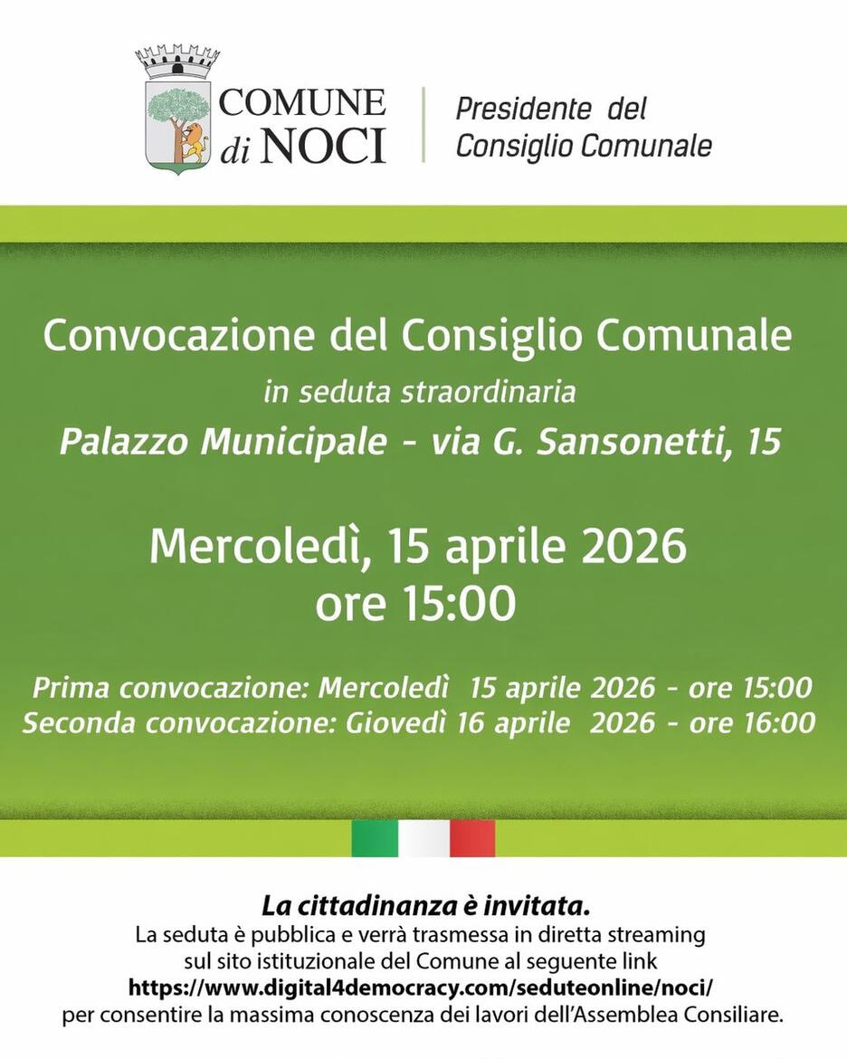 La seduta è pubblica e verrà trasmessa in diretta streaming sul sito istituzionale del Comune https://www.digital4democracy.com/seduteonline/noci/ per consentire la massima conoscenza dei lavori dell’Assemblea Consiliare.