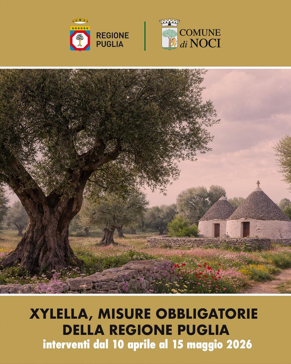 Il Comune di Noci informa la cittadinanza che la Regione Puglia, con apposito atto dirigenziale, ha disposto le misure obbligatorie per il contenimento della diffusione della Xylella fastidiosa.